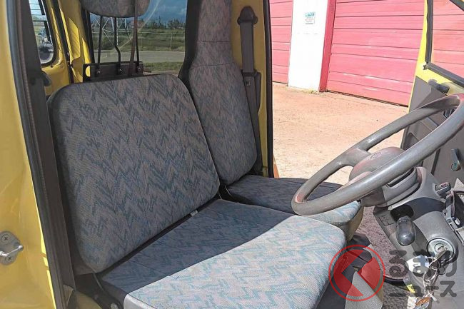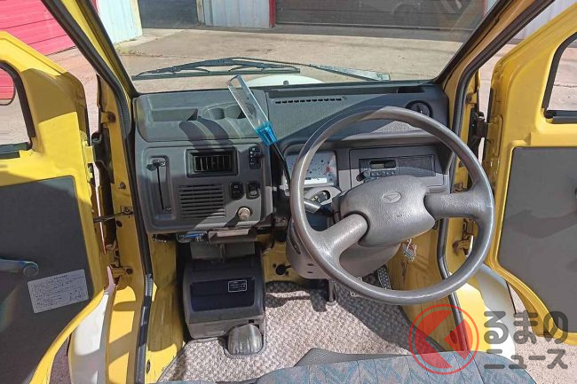 荷室やエアコンを装備しているほか、後部のサイドウィンドウは上に跳ね上がる形で開くポップアウト式となっています。ホイールとシフトノブのみが社外品に交換されています。