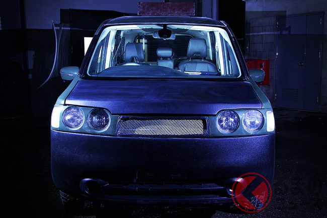 もくもくキャンパーの見た目は、フロント部分に日産「セドリック(Y33)」の顔面らしさを表現するため、同車のヘッドランプを加工して装着。さらにワンオフバンパーやフード、グリルを採用しています。