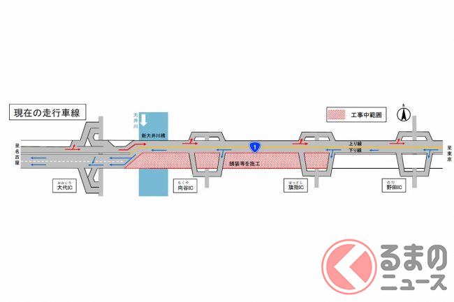 国道1号島田金谷バイパスの4車線化工事に伴い、新大井川橋を含む旗指IC~大代IC間で下り車線が移設されます。