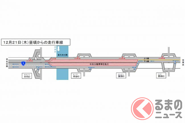 国土交通省中部地方整備局浜松河川国道事務所は2023年12月7日、国道1号島田金谷バイパスの4車線化工事に伴い、21日昼頃に、新大井川橋付近の下り車線(名古屋方面)を移すと発表しました。