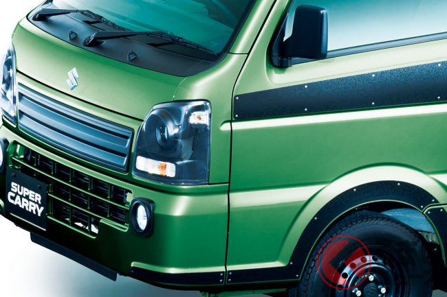 5速MTあり! スズキが「新型軽トラック」を初公開! オシャグリーン×タフカスタムがカッコイイ「スーパーキャリイ」 特別モデル登場に大反響