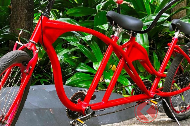 前後に並んだサドルに2人で乗ることができ、2人でペダルを漕いで進みますが、ハンドル操作は前側に座った人が担います。