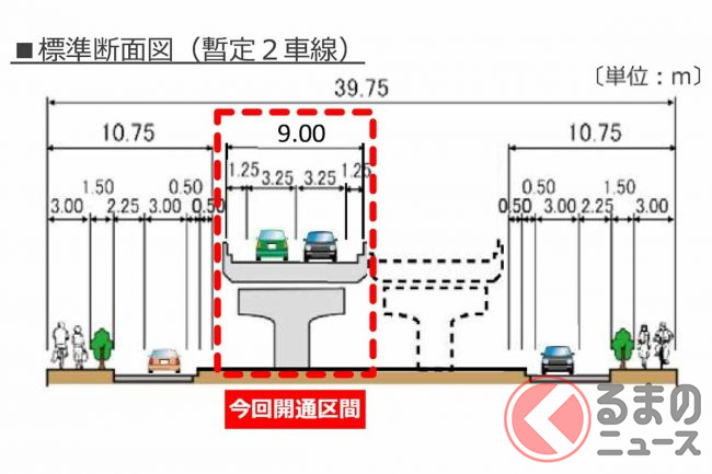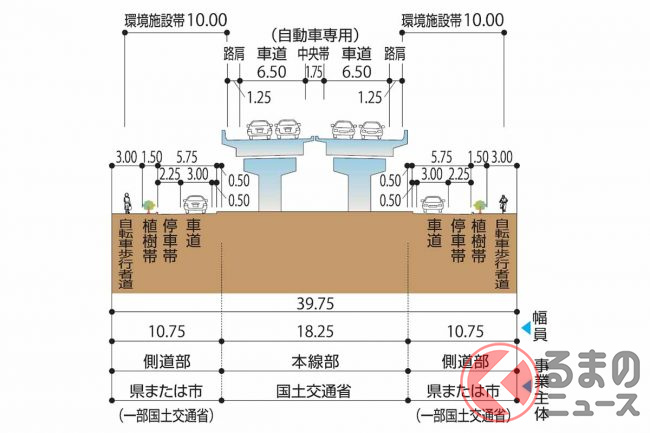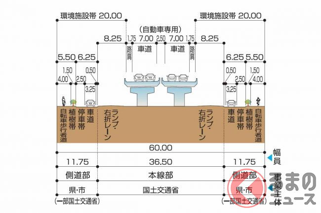 道路は本線部(信号のない自動車専用道路)と側道部からなり、本線部は4車線(片側2車線)・設計速度60~80km/h、側道部は2車線(片側1車線)・設計速度40~60km/hで整備されます。