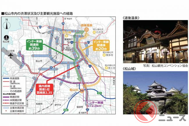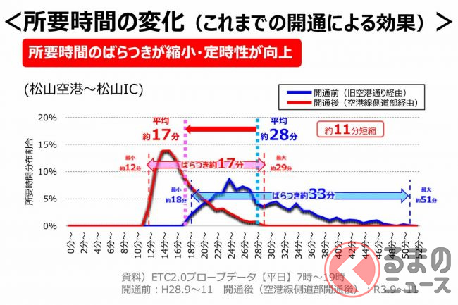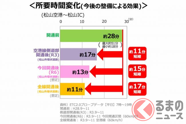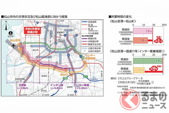 松山河川国道事務所によると、松山IC~松山空港間の所要時間は、側道を通る現在の約17分から、東垣生IC延伸後は約13分に短縮される見込みです。あわせて、松山ICから松山港方面へのアクセス性も向上します。