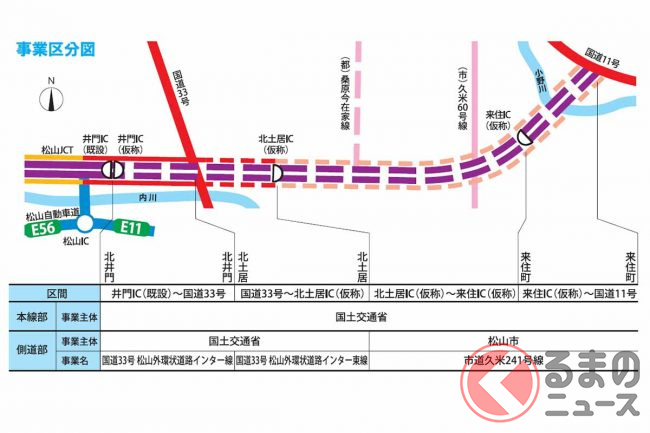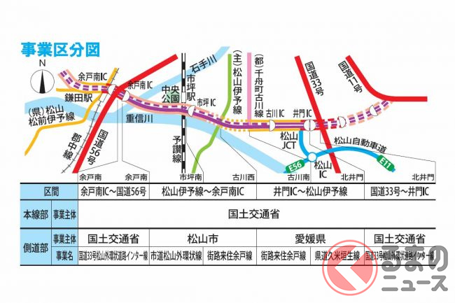 計画区間は松山市内の来住町(国道11号)から北吉田町(県道18号松山空港線)までの10.6kmですが、このうち現在、本線部は松山ICに接続する井門IC(国道32号)から余戸南(ようごみなみ)IC(国道56号)までの4.8kmが、側道部は井門ICから空港付近まで(一部除く)が開通しています。