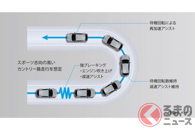 さらに、ドライバー志向に合わせた走りを実現するため、加速度センサーでドライバーの意図を読み取り、制動力と駆動力を制御。スポーツ志向の高い走行を継続している場合、アクセルオフ時の減速アシスト増加やエンジンの待機回転数維持による再加速アシストをすることで、クルマとの一体感をより感じられるコントロール性を実現。