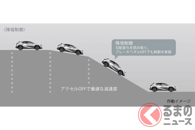 アクセルオフ時の減速度を高めることで、アクセルペダルで車速コントロール性を しやすくし、ブレーキ操作負荷を軽減。加えて、登降坂制御により路面勾配に応じて、加減速をアシストすることで、勾配路でのアクセルやブレーキ操作を軽減し、スムーズでレスポンスの良い走りを提供します。