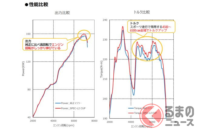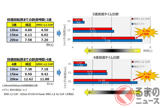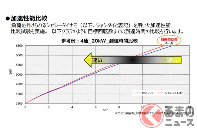 同社は開発にあたって純正マフラーとの性能比較として、シャシーダイナモを用いた加速性能比較試験を実施した結果、純正マフラーに対してすべての条件で目標回転数への到達時間が短縮され、加速性能に優れたマフラーであることが証明されたとしています。