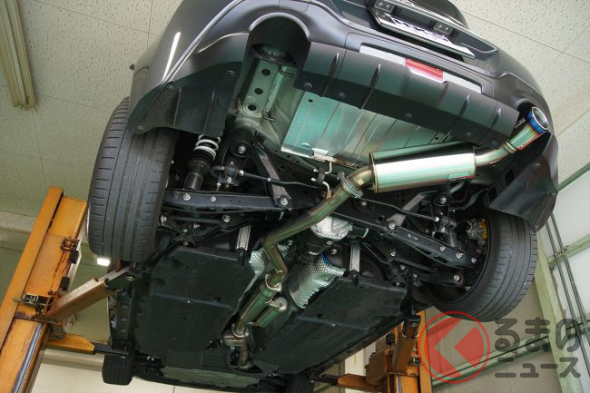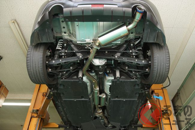 最低地上高も140mmを確保し、純正マフラーに比べプラス7mmの地上高を確保しているそうです。スポーツ走行時のマフラーの横揺れ抑制効果も備えており、不要な慣性力が発生しないよう配慮しているほか、マフラー全体を可能な限りフロア内におさめ、下回りをフラットにすることで、スポーツ走行時の路面とのヒットリスクも低減できるレイアウトになっているそうです。