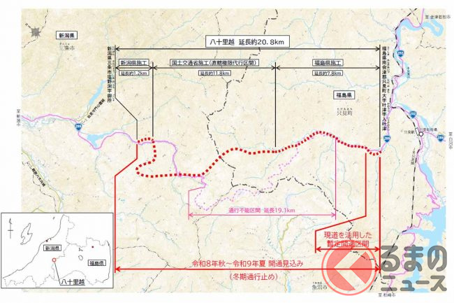 国道289号「八十里越」の開通見込みが、「2026年秋~2027年夏」と発表されました。ただしその際は、一部現道を活用した暫定開通となりそうです。