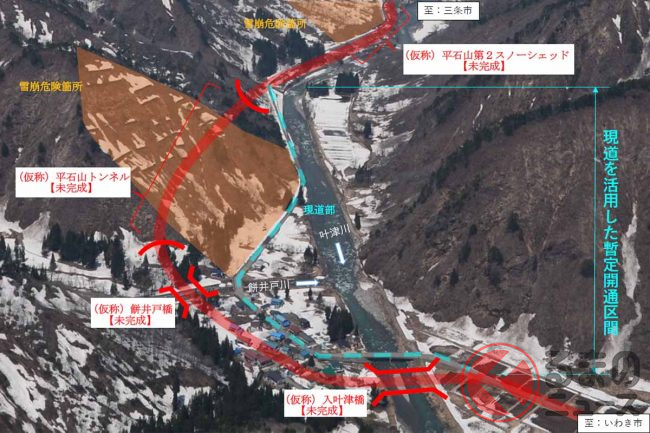 この区間では現在、クルマで通れるようにしようと国交省・新潟県・福島県が共同で道路整備事業を進めています。