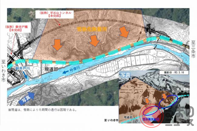また、福島県の施工区間は、平石山トンネル(仮称)周辺で用地取得に時間を要していることや、追加の雪崩対策が必要となることといった課題があり、「2026年秋~2027年夏」の開通の際は、一部現道を活用した暫定開通となるそうです。この場合、現道は依然として雪崩の危険があるため、冬期間は通行止めとなります。