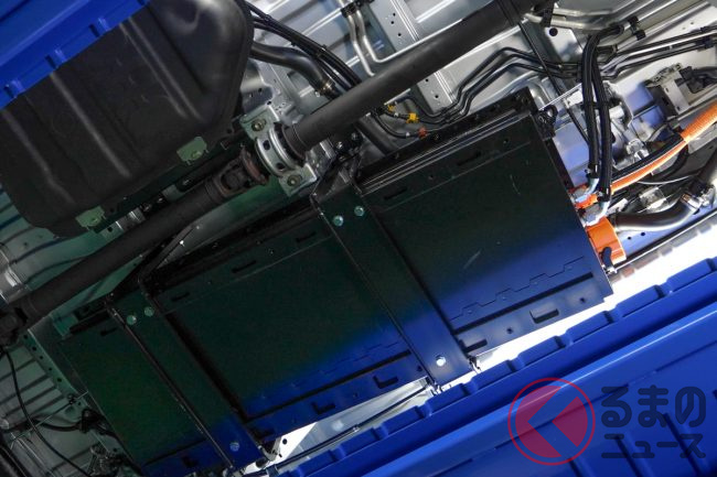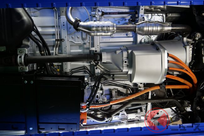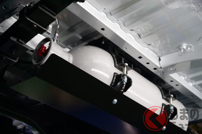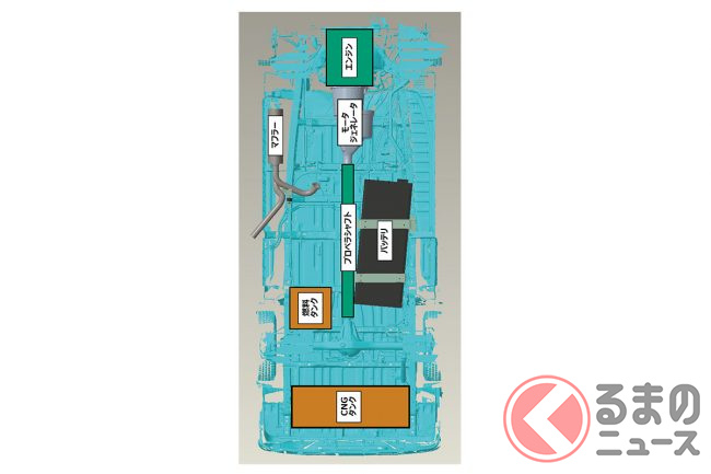 燃料タンクに加えてバッテリーを車両中央床下、ガスタンクを車両後方床下に搭載することでさまざまな動力源に対応させています。