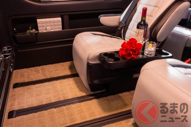 何より驚きなのは内装です。床にはフワフワしていそうなマットを配し、シートにはいかにも質の良さそうな白いレザーを使用。さらに車内の各所にボトルやグラスを置けるスペースが設けていて、車内というよりまるで高級クラブの一室のようです。