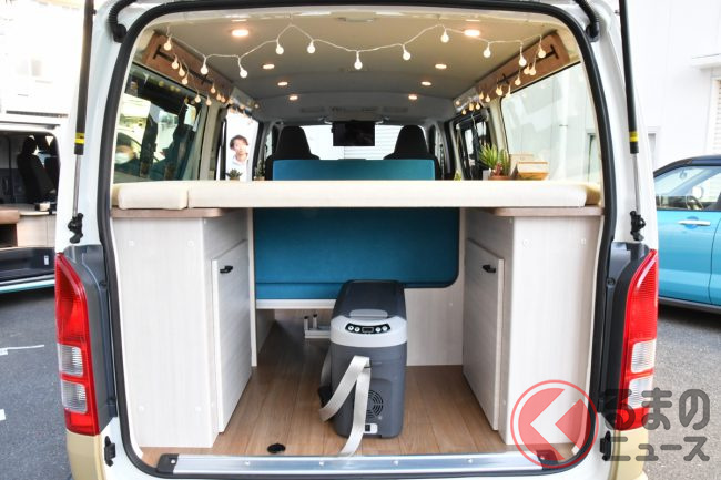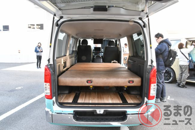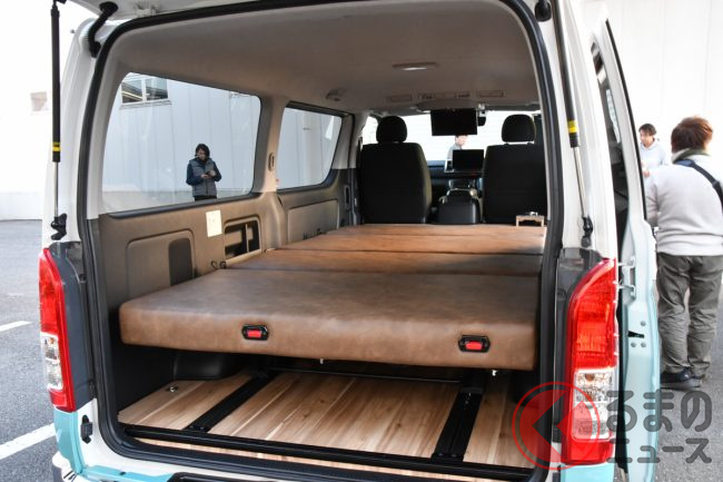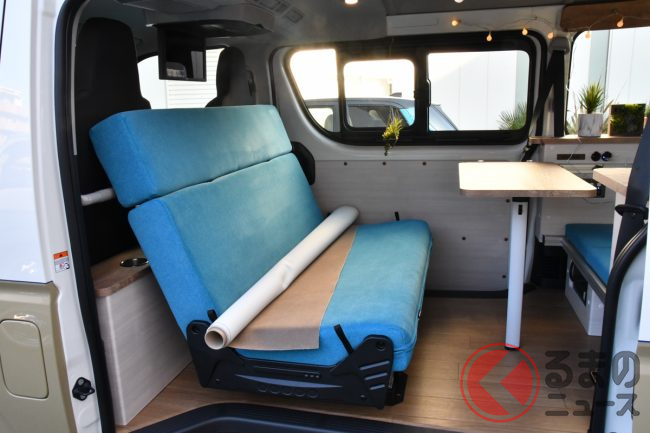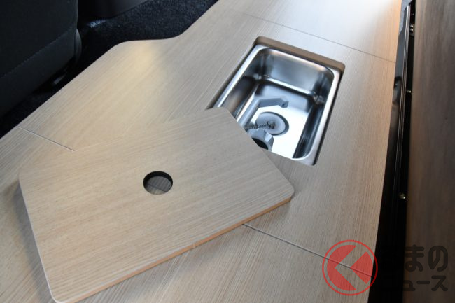 「ミニバン パッケージ」は、ベース車両のシートを交換し、3列目のシートを装備したことにより8人乗りを実現。ISO FIXに対応したバタフライ式REVOシート、3点式シートベルトを採用したことにより、安全な移動を可能にしたとしています。また、フルフラットでのベッド化で手軽に、そして快適に車中泊が実現できると言います。さらに、シンクやコンロといった簡易キッチンを装備したことによりアウトドアシーンでの活用ができ、特殊用途自動車(8ナンバー)としての登録になるとのことです。