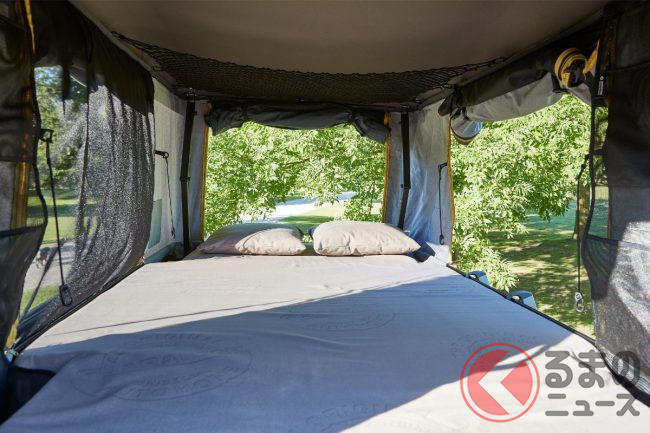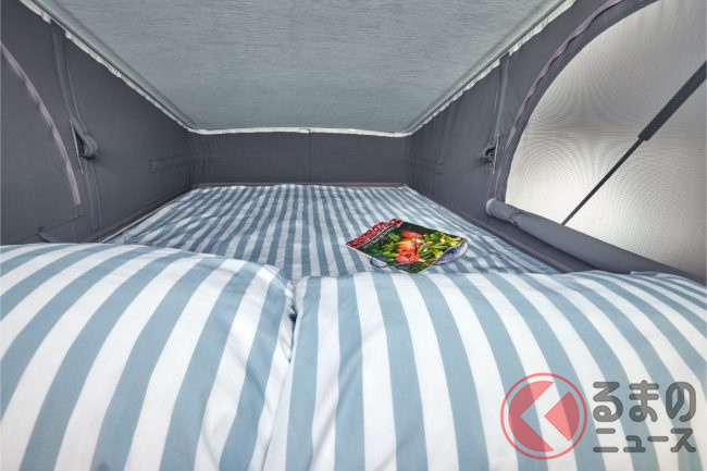 ルーフテントは、イタリアのテントブランドであるマジョリーナが展開する「Maggiolina Airlander Plus Black」で、就寝エリアは130cm×210cmと大人2人が快適に宿泊可能なスペースを持ち、クランクで簡単に展開することができます。