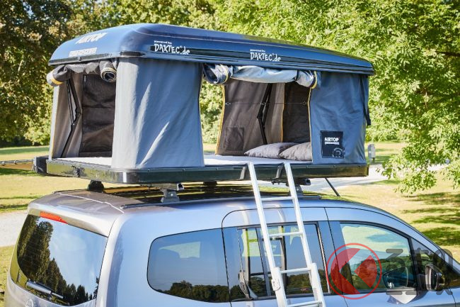 高さ調節可能なアルミニウム製のはしごも備わり、両サイドに設けられた開口部からルーフテントの内部にアクセスできます。
