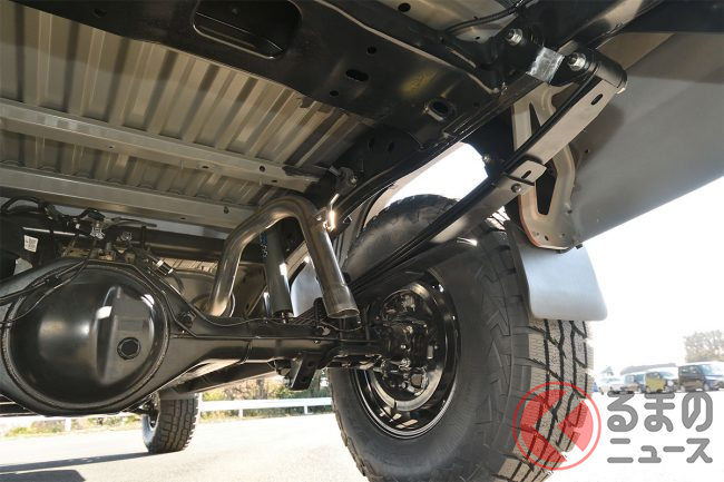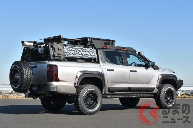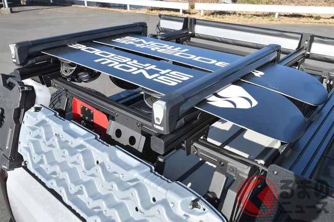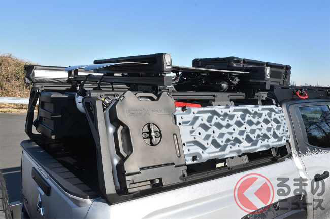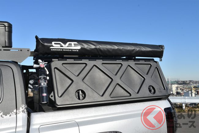 左側には大容量のストレージボックスとタープを装着し、逆側にはタンクとスタックデリバリーラダーを搭載することで、悪路でのアクシデントに備えています。