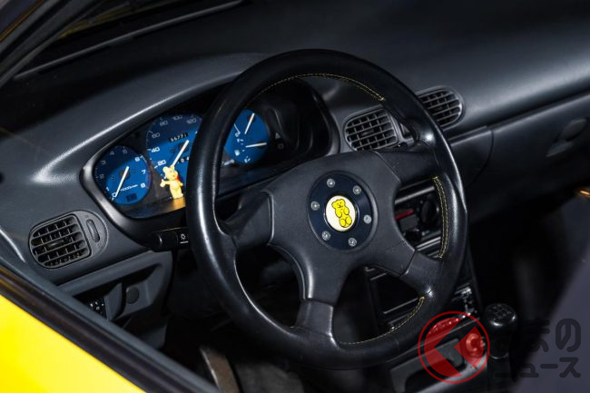 室内にはホーンボタンにハリボーベアが備わるMOMOステアリングにハリボーベアがあしらわれたリアサンシェードが付属し、キャンバストップ仕様となっているルーフにもロゴが備わる徹底ぶりだったのです。