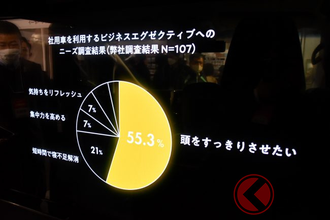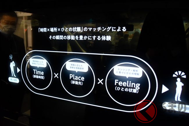 ビジネスシーンへの活用、インバウンド観光を意識した多言語対応、またスポーツやライブ観戦時の移動手段としての盛り上げを担う形など、ニーズに合わせたさまざまな活用法が想定されるデモ体験ができるようになっており、来場者はコンセプトカーに乗り込み、その移動空間を楽しみながらコンテンツを体感する様子が見られました。