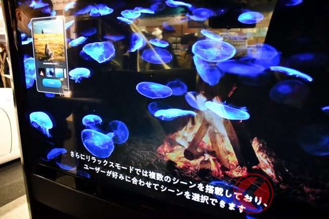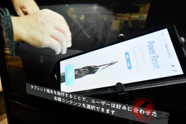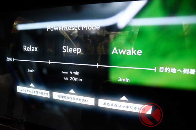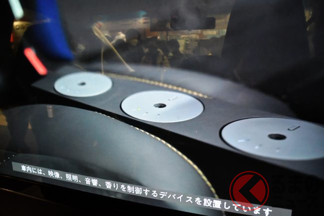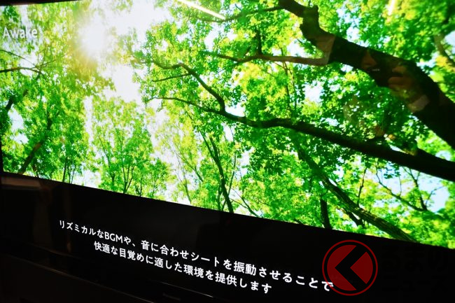 どちらの車両もデモ用にコンテンツが用意され、車内には、有機ELを採用した美しい大画面55インチの映像体験と合わせて、照明、音響、さらにはアロマの香りや、環境に合わせてシートも振動させるなど、座った状態で車室空間全体を演出。