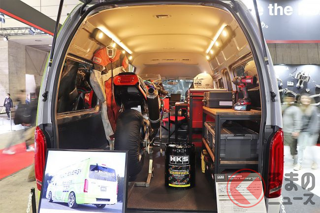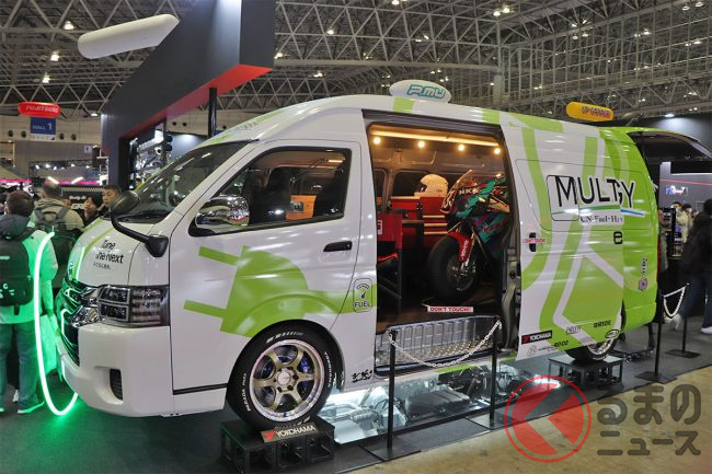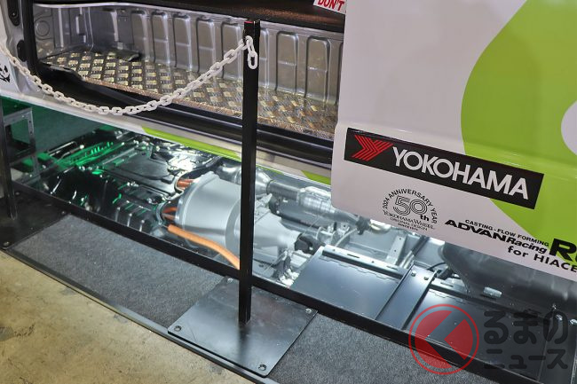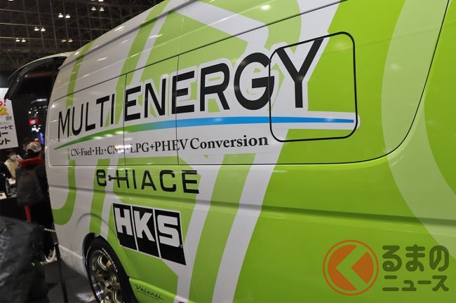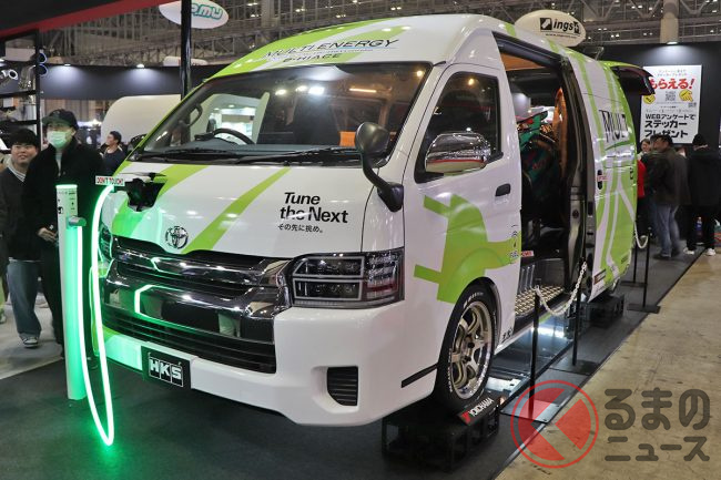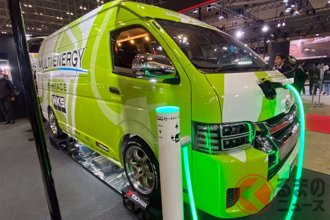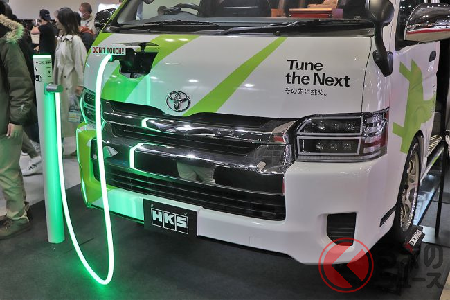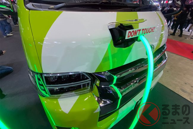 2024年1月12日から14日まで開催された「東京オートサロン2024」で、大容量のリチウムイオンバッテリーを搭載したプラグインハイブリッド車(PHEV)の200系現行ハイエース「e-ハイエース」が出展されていました。市販化も想定されているといいます。