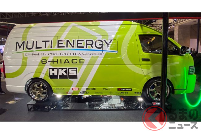 東京オートサロン2024で出展されていたのは、現行型ハイエース(200系)のワイド・ハイルーフ・スーパーロングボディ仕様をベースにした「HKS e-HIACE MULTI ENERGY CONCEPT(イーハイエース マルチエナジー コンセプト、以下e-ハイエース)」。