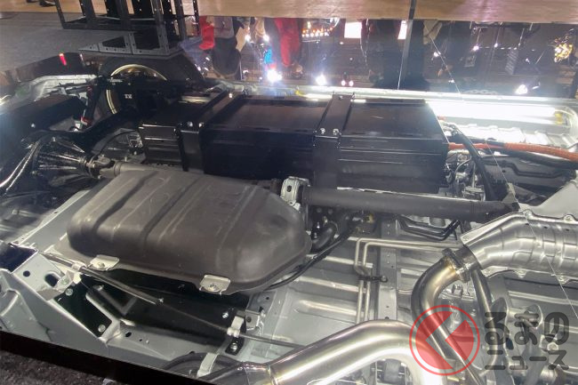 リアのフロア下に設置した別置きタンクには、カーボンニュートラル燃料を積んでいる想定としています。