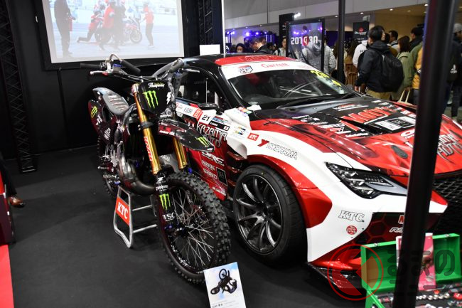 東京オートサロン2024の同社ブースでは、「FORMULA DRIFT JAPAN(以下FDJ)」に参戦中のチューニングショップである「風間オートサービス(Team kazama with powervehicles)」の2024年ラッピング仕様のレクサス「RC」を初披露したほか、フリースタイルモトクロス(FMX)プロライダーとして国内外で活躍する釘村孝太氏のモトクロッサーが展示されました。