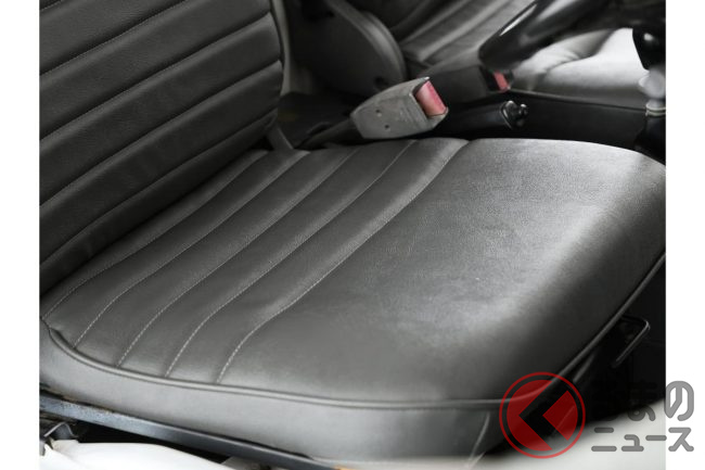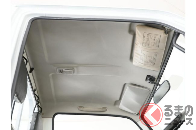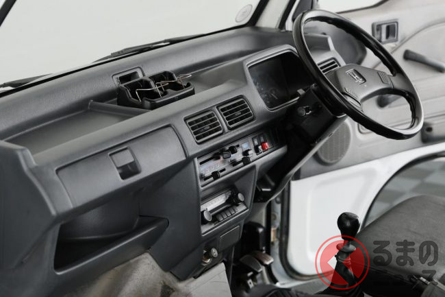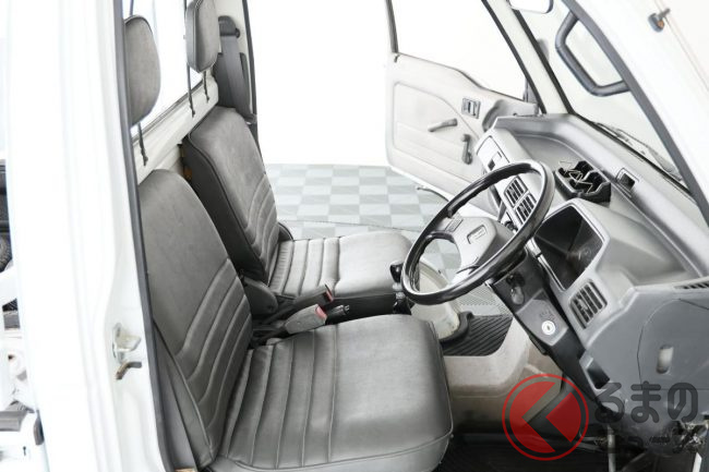 インテリアは運転席と助手席のドアパネルが紫外線による影響などで、著しく白化が進んでしまっていますが、割れのないダッシュボードや黒々としたゴム製フロアマットなどは30年経過した軽トラックとしては綺麗な状態です。