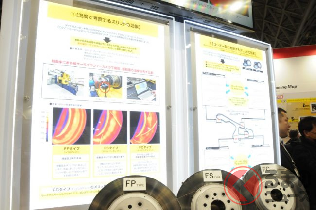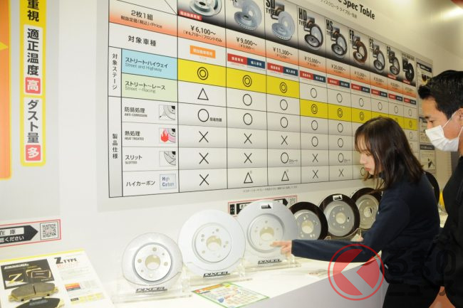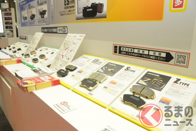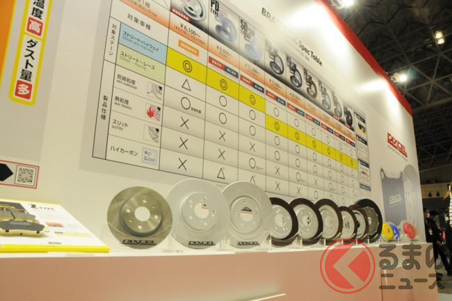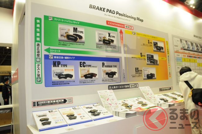 両コーナーとも、実際のブレーキパッドとディスクローターも展示しており、ブース担当者は「どういったブレーキが良いか迷っているお客さま向けに、選びやすいパネルを用意しました」と話していました。