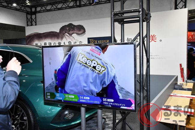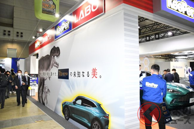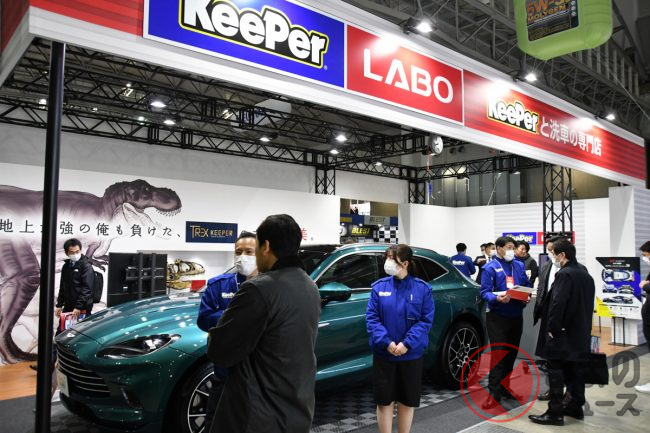 東京オートサロン2024の展示ブースは、キーパーラボの店舗外観が表現され、展示ブース内にはTREXキーパー専用ブースをイメージした場に、TREXキーパーを施工したアストンマーティン「DBX」を展示。施工の過程を紹介する動画も紹介されたKeePerブースは、多くの来場者でにぎわいを見せていました。