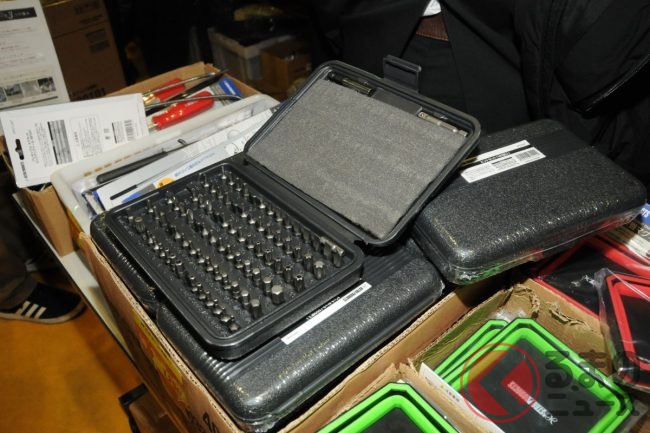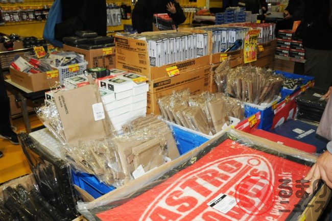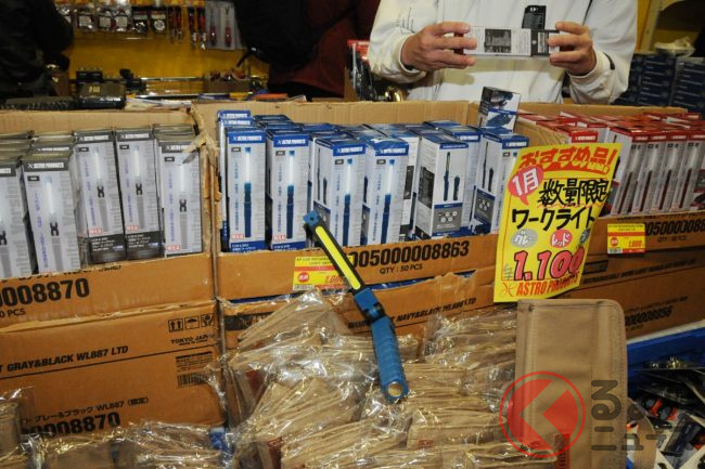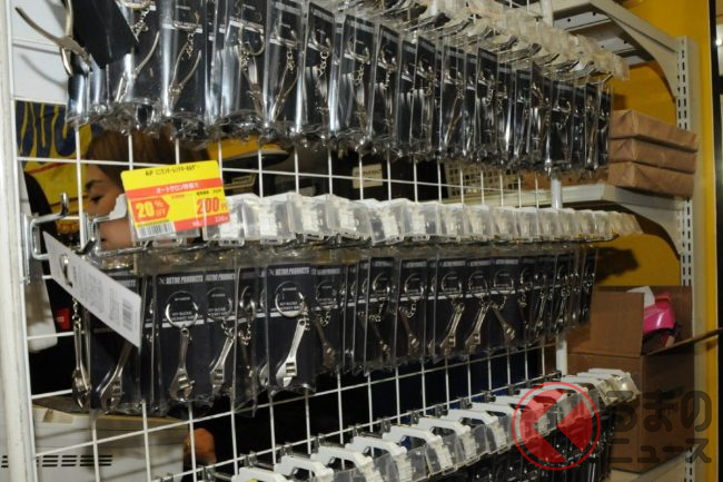 ブースにはさまざまな工具が所狭しと並び、「おすすめ品」「オートサロン特価」と値札が付けられた商品の数々をじっくりと品定めする人たちの姿が見られました。