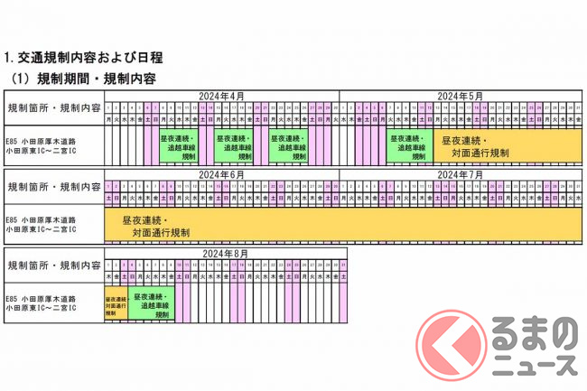 期間は、4月8日9時から8月9日24時まで。車線規制は、4月の土日とゴールデンウィーク期間(4月27日0時~5月7日9時)は実施されませんが、5月13日以降は対面通行を伴う規制が土日や海の日の3連休も実施される計画です。