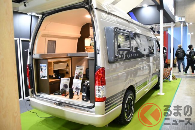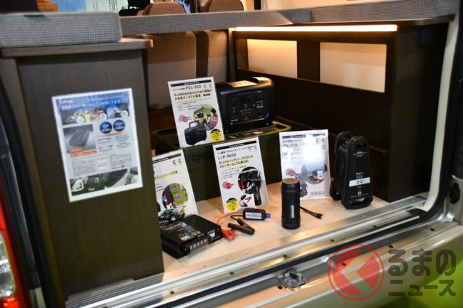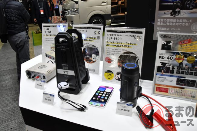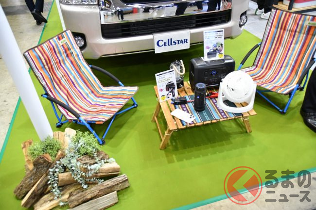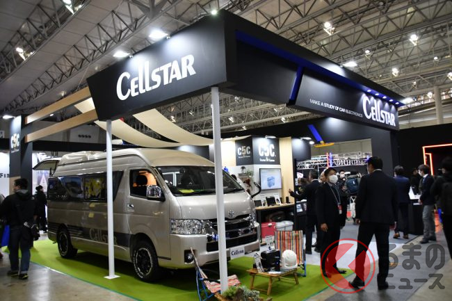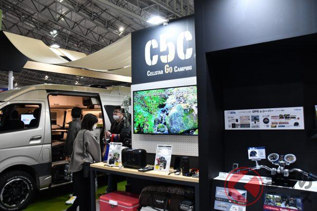 キャンプやアウトドア、災害時まで活躍する電源製品である「C5Cシリーズ」は、昨今需要の高まるアウトドアシーンにおいて「Cellstar Go Camping」をテーマとした、より楽しく、新しく、快適なカーライフを提案する新シリーズだと言います。ブースには、キャンピングカー仕様のトヨタ ハイエースと、キャンプ用品を展示するなどして、同シリーズを活用するアウトドアシーンを想起させる演出が行われました。