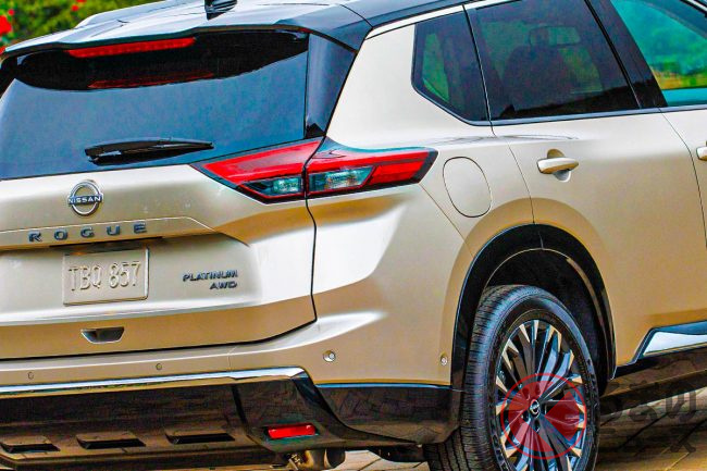 リアは新意匠のテールライト、サテン仕上げのエンブレムや車名ロゴが目を引きます。また、最上位グレード「プラチナ」に、ダーク塗装の19インチアルミホイールやグロスブラックのフェンダーを装着したほか、インテリアにレザーを採用するなど高級感を高めています。