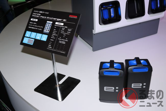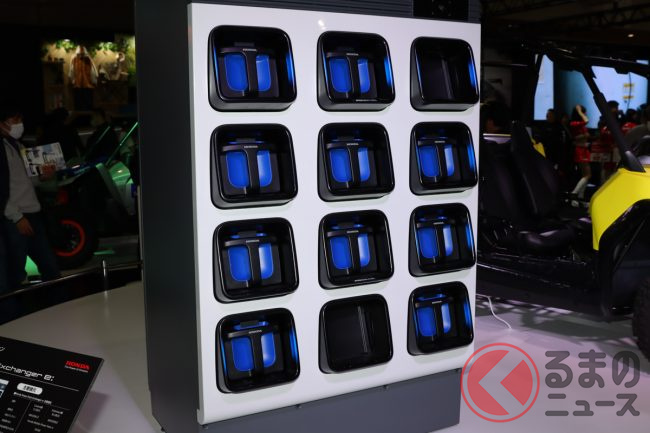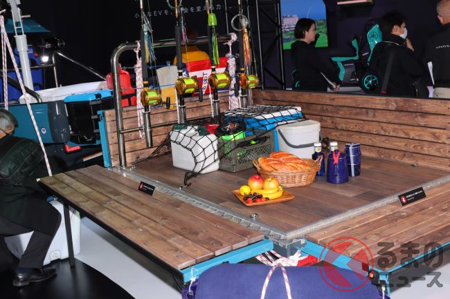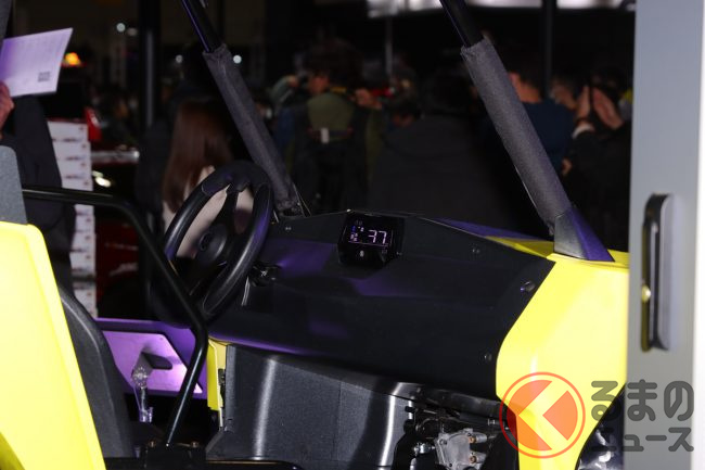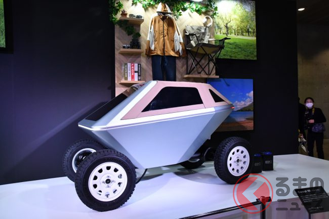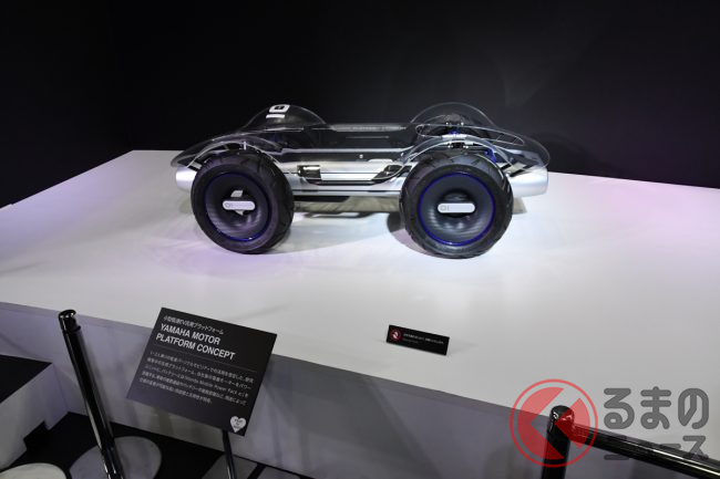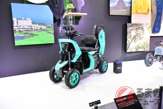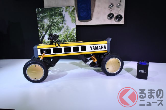 同社ブース中央には、1~2人乗りの低速パーソナルモビリティとしての利用を想定した研究開発中のEVプラットフォーム「YAMAHA MOTOR PLATFORM CONCEPT」を活用したプロトモデル「Concept 580」を展示。同社製の電動モーターをパワーユニットに、バッテリーは「Honda Mobile Power Pack e:」を搭載し、車体の複数連結やバッテリーの複数搭載など、用途によって仕様の変更が可能な高い自由度と汎用(はんよう)性が特長だとしています。