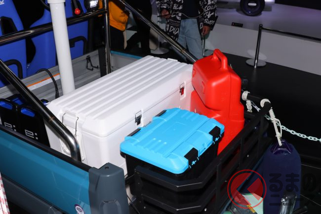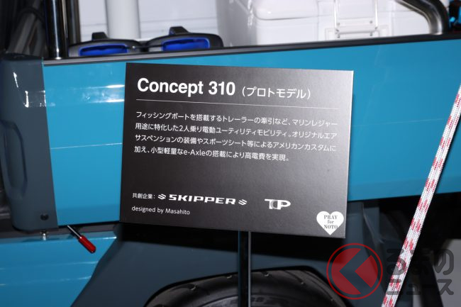 フィッシングボートを搭載するトレーラーのけん引など、マリンレジャー用途に特化した2人乗り電動ユーティリティーモビリティである「Concept 310」は、オリジナルエアサスペンションの装備やスポーツシート等によるアメリカンカスタムに加え、小型軽量のe-Axleの搭載により高電費を実現したとしています。