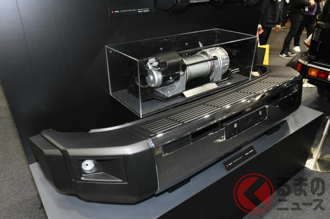 同車には、フロントバンパーガーニッシュ、フロントアンダーカバー、リアバンパーカバー、フラットラック、リアラダー、ラゲージトレイなど、80年代黄金期の四駆を思わせる鉄板パーツを装着。