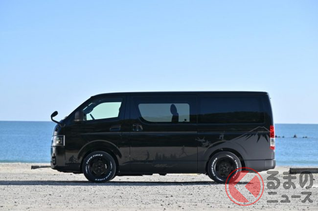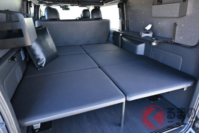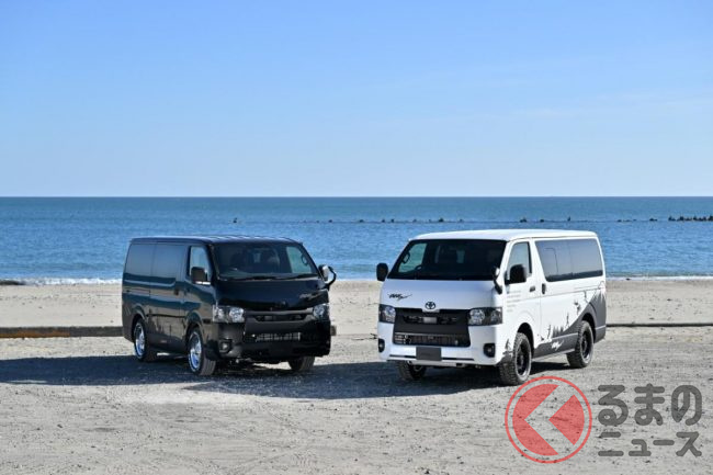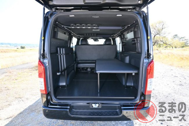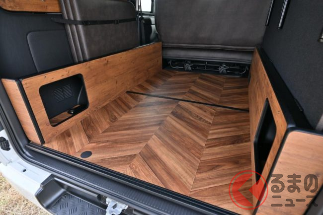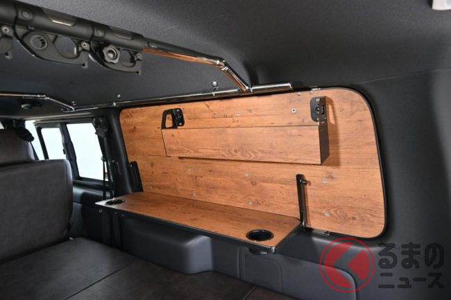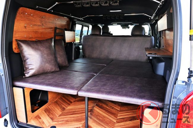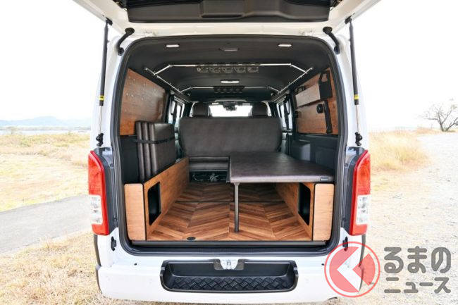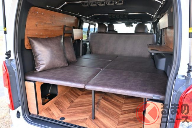 トヨタ「斬新商用バン」実車展示! 木目パネルの豪華内装がスゴい! レザー地ベッドもオシャレ感UP!? 「カスタムハイエース」とは