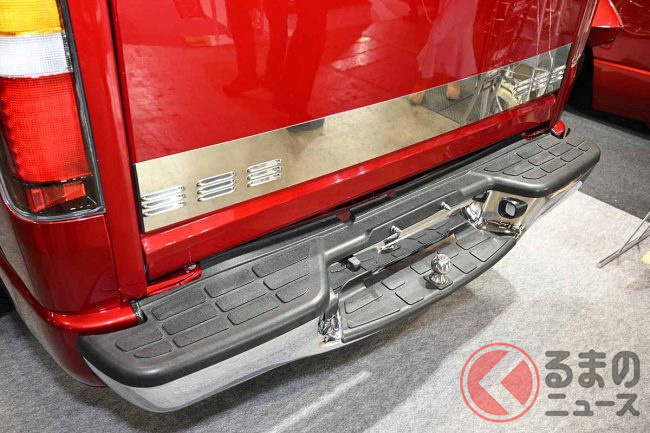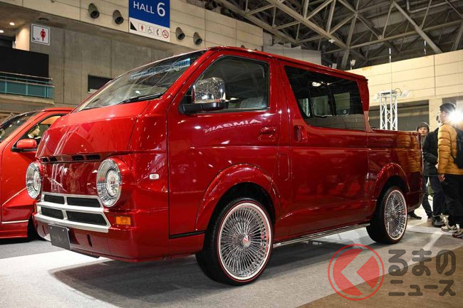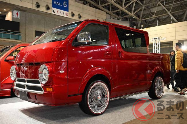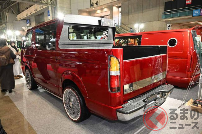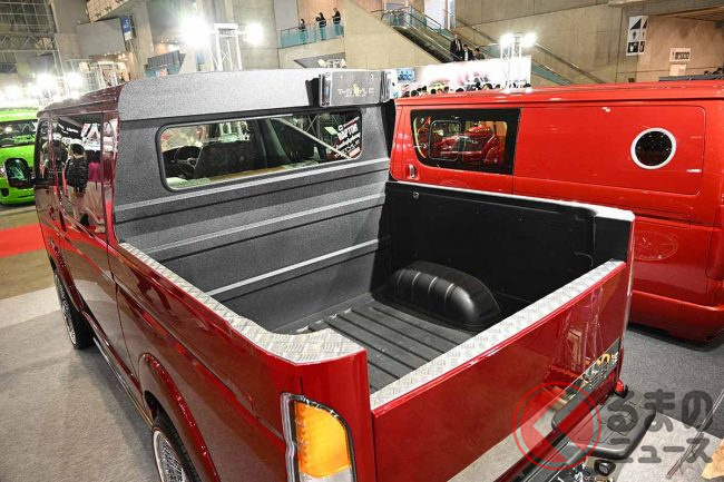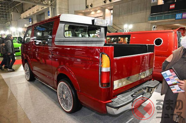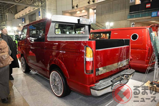 トヨタ「ハイエース“トラック”」初公開! 車体後部がまさかの荷台に! 大胆カット&鮮烈レッド&レトロ顔の「Hi-Truckin‘」実車展示
