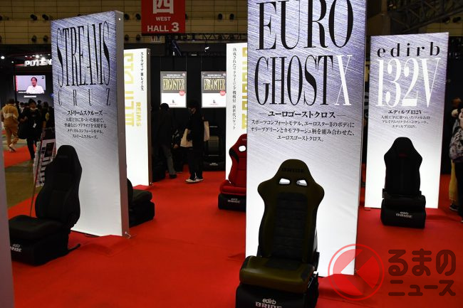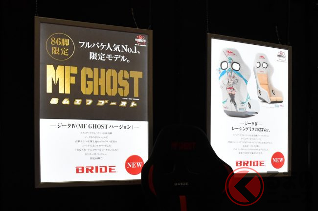 そのほかにも、ブリッドとグッドスマイルレーシングがコラボレーションしたスポーツシート「ZETA IV レーシングミク2023 Ver.」(2024年1月15日〜3月31日期間限定受注生産)や、「頭文字D」の後継作である「MFゴースト」とコラボレーションした限定86脚のフルバケットシート「ZETA IV REIMS MF GHOST」も展示されていました。