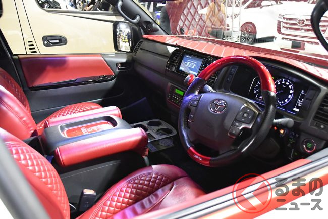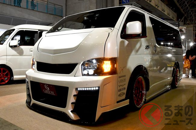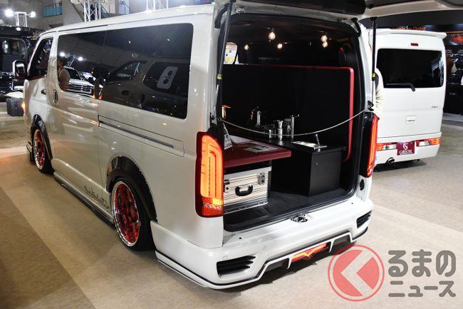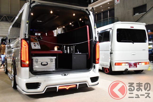 近年、カスタムカー業界で特ににぎわっているのが、ハイエースのカスタマイズです。今回のオートサロンでもハイエース向けの商品が多数見受けられ、ハイエース系のアクセサリーパーツを多く取り扱っている「GIBSON」のブースでは、新たにハイエース用の「GRAVISキャンピングキット」と「GRAVIS/GRAFAMベッドキット」を大々的に展示していました。