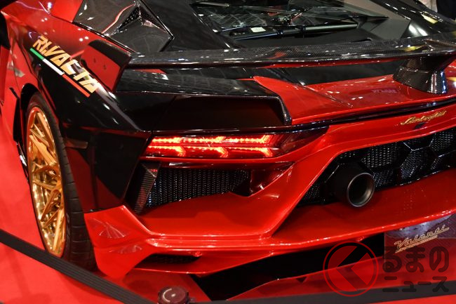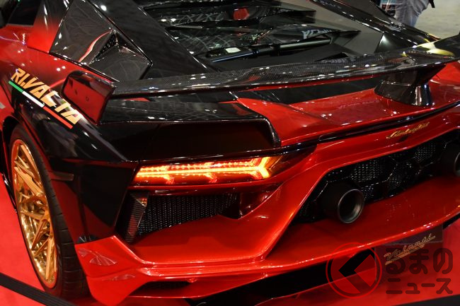 さらにサイドミラーにも新製品のジュエルLEDを採用。その隣には、通常モデルのリアランプには設定のないシーケンシャルウインカーを装着したアヴェンタドールも展示されていました。豪華な西陣織のボディと光の演出によって、異彩を放つ展示となっていました。