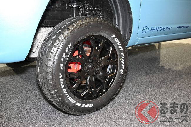 また大幅なリフトアップや、トーヨータイヤ製「オープンカントリーA/T EX」オフロードタイヤのラギッド感と相まって、力強い印象を与えています。