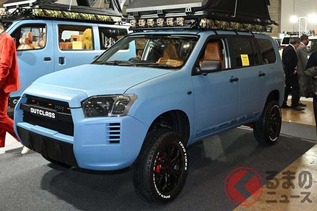 トヨタの「”SUV”商用車」実車公開!? めちゃタフ顔が超カッコイイ! 鮮烈ブルーのアゲアゲ「プロボックス」とは