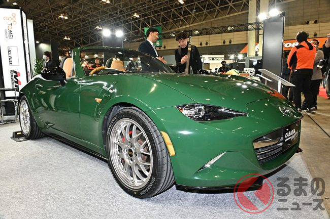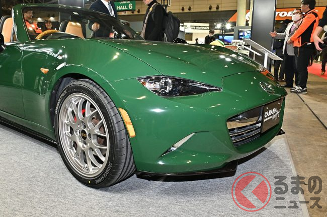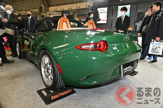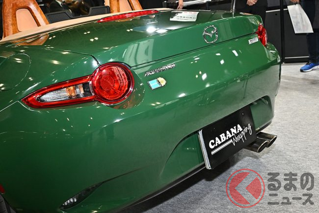 マツダ「新型ロードスター レトロ仕様」初公開! オシャグリーン×タン内装がカッコイイ! 「初代」を見事再現のカスタムモデルとは