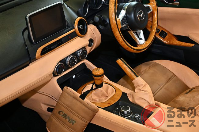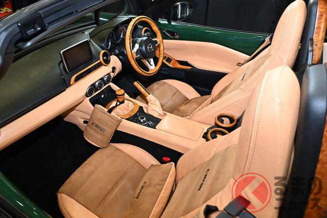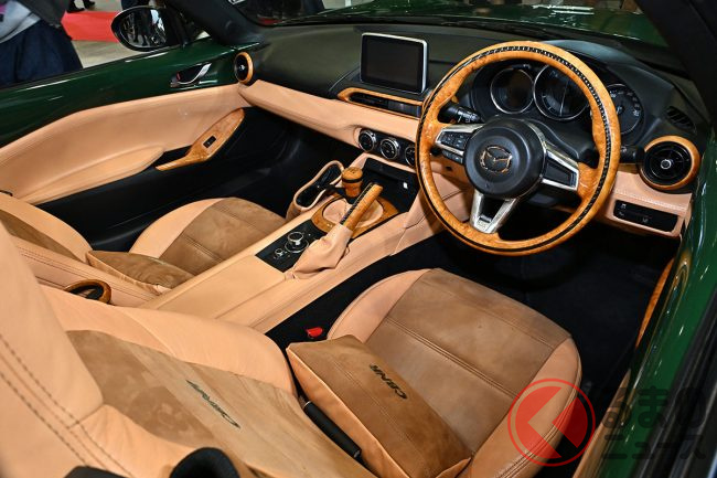 カバナのNDロードスターには、初代ロードスターのVスペシャルを思わせるタンカラーのシートを装着し、ボディカラーも初代を思わせるネオグリーンとなっている点が最大の特徴です。