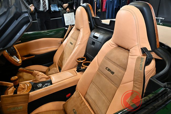 そのほか、カバナブースで展示されたデモカーには、初代Vスペシャルに装着されていたナルディ製ウッドステアリングを思わせるオリジナルステアリングやサイドブレーキレバーのほか、今後市販を検討しているというドアトリムやインパネ、センターコンソールなどのタンカラーでの張り替えなども実施。