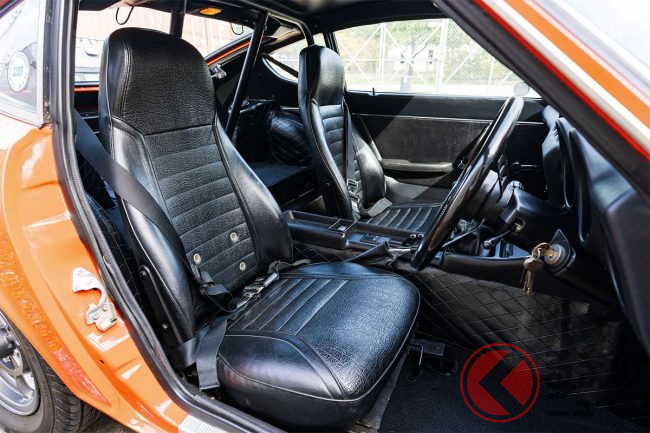 ハンドル位置は日本から輸入した時と同じく右側のまま。車内には上質なバケットシートやドアパネル、レトロな3本スポークのステアリングホイールなどを備えています。